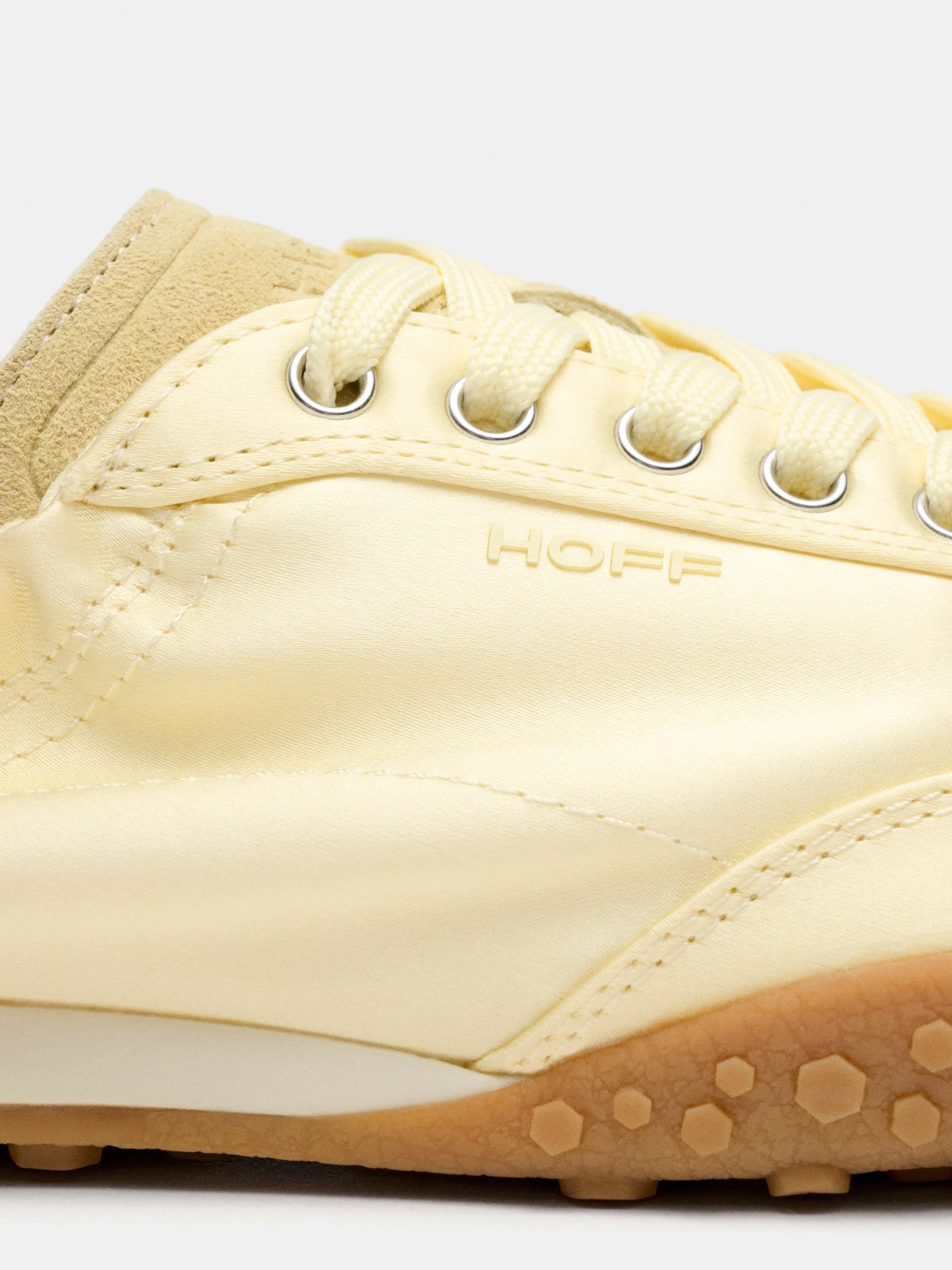 Sneaker monocolor confeccionada en satén y piel. Parte trasera con detalle de logo y elástico fruncido para mayor ajuste. Suela con textura. Cierre mediante cordones a tono.